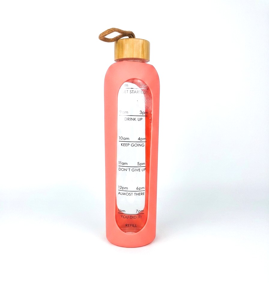 1L Glass Water Bottle with Bamboo Lid & Time Marker | 1000ml Borosilicate Reusable Bottle with Silicone Sleeve | Leak-Proof Sports Gym Travel Bottle (Pink)